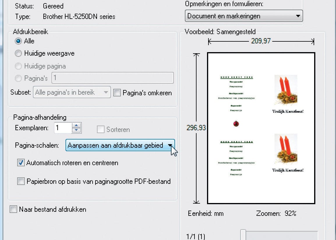 Om de kaart af te drukken klikt u in het menu File op Print en na even wachten verschijnt het vertrouwde Windows-afdrukvenster. Mocht het geheel om de een of andere reden niet helemaal passen (dat is in het voorbeeldje al te zien), selecteer dan in de sectie Pagina-afhandeling achter Pagina-schalen de optie Aanpassen aan afdrukbaar gebied. Druk de menukaarten bij voorkeur af op wat dikker papier, vouw de zaak dubbel en zet de kaarten - al dan niet voorzien van een vrolijk lint - op de (kerst)tafel.
