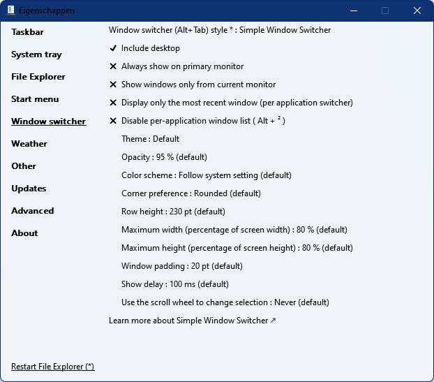 Je kunt de Windows-omgeving op diverse manieren aanpassen, maar ExplorerPatcher voegt een heel scala aan configuratie-opties toe, voor Windows-onderdelen als de taakbalk, het systeemgebied, het startmenu en Verkenner. Na de installatie open je het configuratievenster door met rechts op de Windows-taakbalk te klikken en Eigenschappen te kiezen. Je treft hier tien rubrieken aan, waaronder de zojuist genoemde onderdelen.