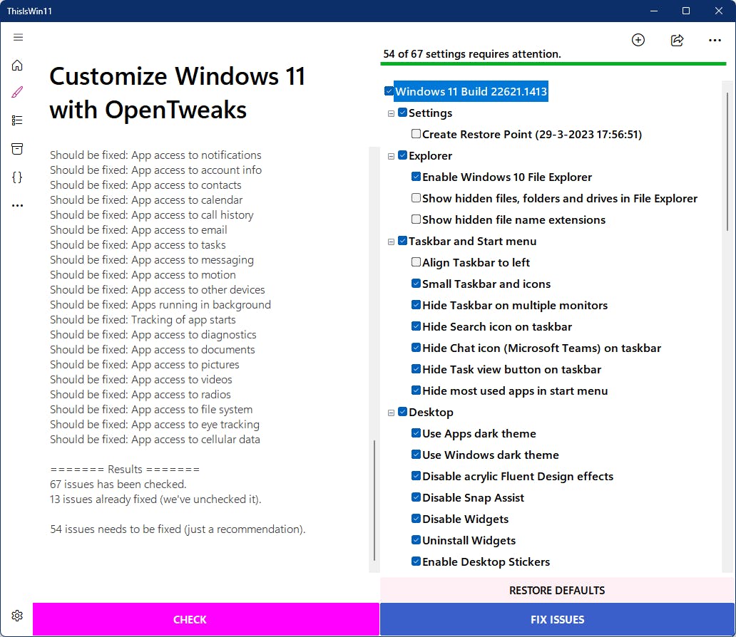 De eerste rubriek bevat 70 opties. Druk op Check om na te gaan hoeveel en welke opties voor jouw systeem aandacht vereisen. Deze kun je dan met Fix issues in één keer doorvoeren.