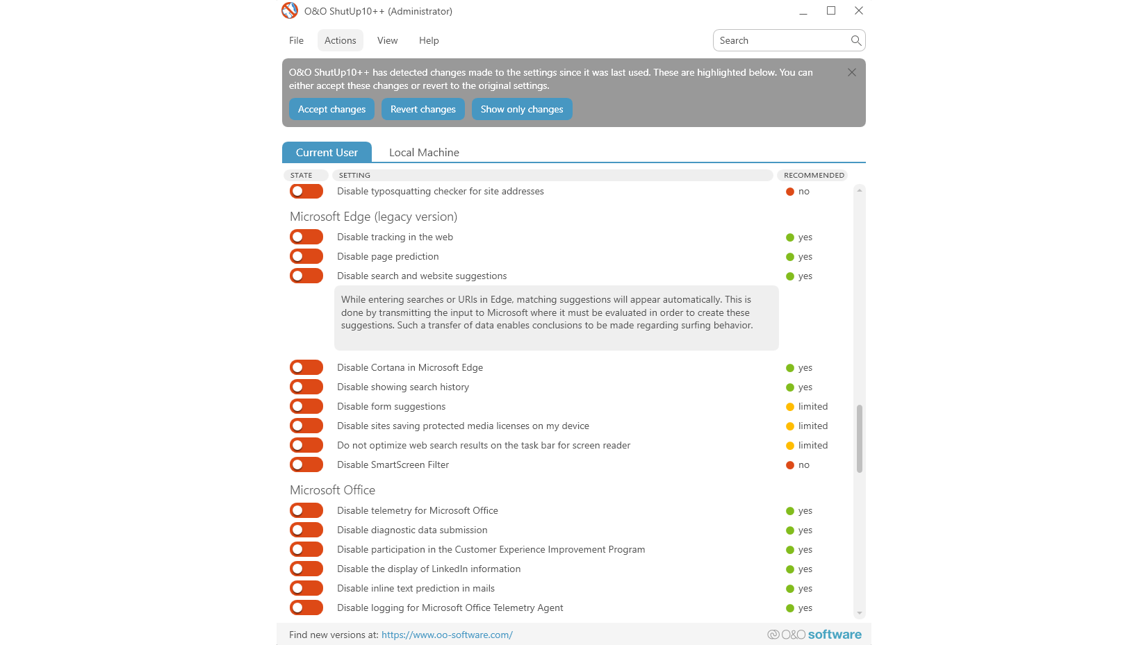 Via de tabbladen Local Machine en Current User maakt het programma een onderscheid tussen instellingen die op machineniveau doorwerken of alleen op de aangemelde gebruiker van toepassing zijn. Op beide tabbladen merk je tientallen instellingen op, opgedeeld in rubrieken zoals Privacy, App Privacy, Microsoft Edge, Microsoft Office.