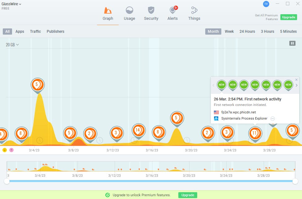 We beperken ons hier tot de interessantste mogelijkheden. Zo krijg je op het tabblad Graph een actueel en historisch overzicht van je netwerkverbindingen, tot een maand terug. Een druk op de knop Traffic volstaat om dit dataverkeer volgens protocoltype te bundelen. Je hoeft in de grafiek maar op een specifiek tijdstip te klikken om de verbindingen van dat moment in meer detail te zien.