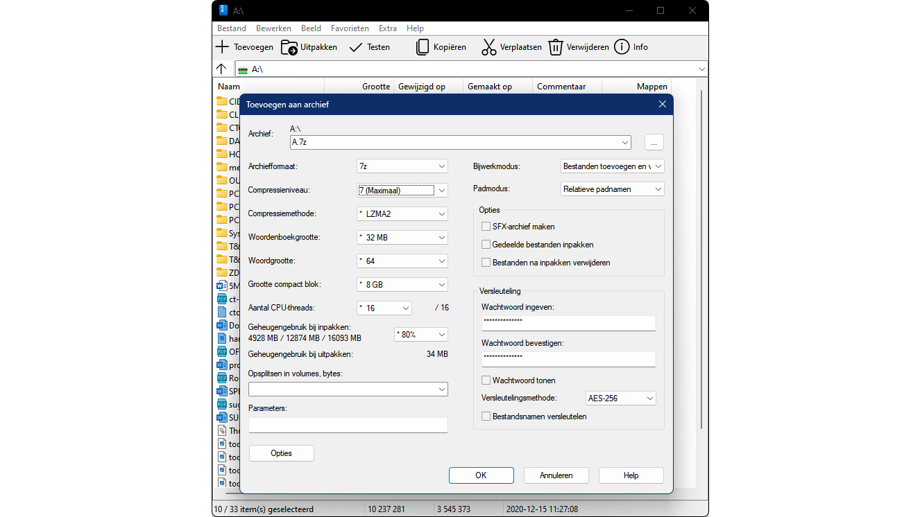 Net als 7-Zip kun je ook NanaZip vanuit een afzonderlijk programmavenster aansturen. Dit venster bevat een bestandsbrowser waar je de gewenste items met een paar muisklikken archiveert. Tenzij je liever nog wat aan het archiveringsproces sleutelt, want er zijn tig opties beschikbaar. Zo kun je uit een aantal archiefformaten kiezen (naast 7z ook zip, wim en tar), kun je de compressiemethode en het -niveau instellen, een zelfuitpakkend archiefbestand (exe) maken of het archief met een wachtwoord versleutelen. Handig is verder dat NanaZip de integriteit van een archiefbestand kan controleren.