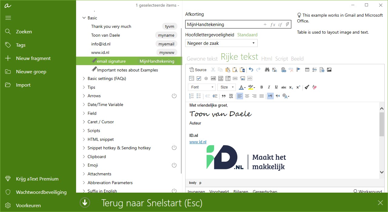 De app heeft standaard al een hele reeks voorbeelden die je al meteen kunt testen vanuit de rubriek Examples & Guides. Uiteraard kun je de bestaande voorbeelden aanpassen en eigen tekstmacro’s toevoegen. We raden je aan hier alle onderdelen goed te bekijken, want er is heel wat mogelijk. Je kunt bijvoorbeeld ook geformatteerde tekst en zelfs afbeeldingen koppelen aan een tekstmacro, bijvoorbeeld om snel een bepaald logo of handtekening te plaatsen. Of je maakt gebruik van systeemvariabelen om bijvoorbeeld snel een pad of een datum in te voeren. aText kan overweg met diverse scripts, waaronder cmd (batch), PowerShell, JavaScript en VBScript.