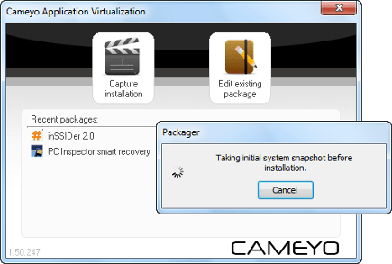 Sluit alle programma’s af voordat u met Cameyo aan de slag gaat. Hiermee voorkomt u dat Cameyo per ongeluk verkeerde wijzigingen waarneemt. Start Cameyo en kies Capture installation. Er wordt een snapshot gemaakt, dit kan enkele minuten duren. Zodra de snapshot klaar is verschijnt het venster Proceed with installation. Voer nu de installatie uit van het programma waarvan u een portabele versie wilt hebben. Doorloop de installatieprocedure, maar start het programma niet op. Klik in het Cameyo-venster op Install done zodra de installatieprocedure is afgerond. In sommige gevallen is een herstart van uw computer vereist. Voer deze uit. Cameyo maakt een nieuw snapshot en creëert een portabele versie van het programma. Het eindresultaat wordt bewaard in de map (Mijn) Documenten / Cameyo Packages. In dit voorbeeld heeft het bestand de naam ‘inSSIDer 2.0.virtual.exe’. Verwijder de geïnstalleerde versie van de door u gekozen software via uw configuratiescherm en probeer of de portabele versie gelukt is, door uw versie van het exe-bestand op te starten.
