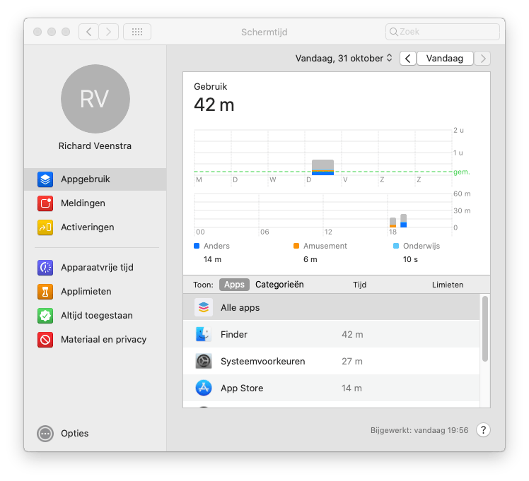 Een functie die je wellicht kent van je iPhone is Schermtijd. Hiermee heb je inzicht hoeveel tijd je op het internet doorbrengt of besteedt aan nutteloze dingen. Schermtijd vind je nu ook in macOS als je op Systeemvoorkeuren klikt en voor Schermtijd kiest. Onder Apps zie je welke programma’s je vandaag hebt geopend en hoeveel tijd je met de app hebt gewerkt. Je kunt echter ook op Categorieën klikken en een helderder overzicht krijgen van je activiteiten. Immers, dat je 42 minuten in Finder hebt doorgebracht, is niet erg zinvolle informatie. Bovenin kun je naar andere dagen navigeren.