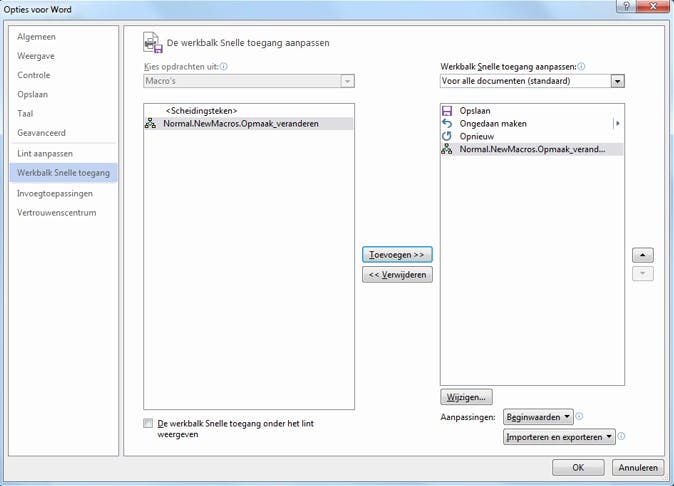 Er verschijnt een venster waarmee u de macro kunt toevoegen aan de werkbalk Snelle toegang. Selecteer de macro en klik op Toevoegen om te beginnen met opnemen. Voer nu de handeling uit die je wilt automatiseren. In dit geval selecteren je de hele tekst met CTRL + A en klikt daarna op de knop ´Alle opmaak wissen´ (de A met de gum) om de hele opmaak te wissen. Daarna stel je het gewenste lettertype en de grootte van de tekst in. Hebt je dit gedaan dan klik je op Opname stoppen en de macro is gemaakt.