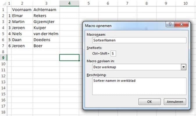 Macro's in Excel werken vrijwel hetzelfde. In dit voorbeeld maken we een macro die alle gegevens in het werkblad sorteert. Maak bijvoorbeeld een lijst met personen met een voor- en een achternaam. Deze kun je op alfabetische volgorde sorteren en om nou niet steeds dezelfde actie te hoeven uitvoeren maken we daar een macro voor. Klik op Beeld / Macro's / Macro opnemen en geef de macro een naam, bijvoorbeeld SorteerNamen.