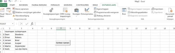 Vooral in Excel is het een aanrader om dit tabblad toe te voegen. Je kunt in het programma namelijk geen knop toevoegen als je een macro toevoegt via het tabblad Beeld. In het tabblad Ontwikkelaars heb je die optie wel. Je ziet hier links de optie om een macro op te nemen en dat werkt daarna gewoon hetzelfde als we hierboven uitgelegd hebben. In het midden kun je klikken op Invoegen. Kies hier voor een knop en dan kun je de knop tekenen in het werkblad. Heb je dat gedaan dan opent een venster met een overzicht van alle macro's en kun je de macro kiezen die je wilt gebruiken en die toekennen aan de knop. Selecteer de macro en druk op OK. De knop is dan aangemaakt en je kunt de tekst van de knop nog veranderen naar Sorteer namen bijvoorbeeld. Als je nu op de knop drukt zullen de namen gesorteerd worden.