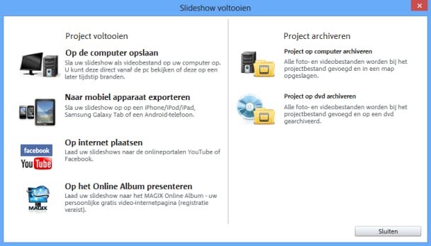 Zodra je tevreden bent met het resultaat, kun je de diashow vereeuwigen op schijf (dvd of blu-ray). Indien gewenst, kun je zelfs nog een intromenu maken. Er zijn heel wat sjablonen beschikbaar en met een beetje creativiteit knutsel je zelf nieuwe sjablonen in elkaar. Uiteraard zijn er flink wat exportfuncties.