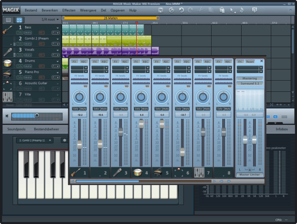 Gebruikers die niet bekend zijn met Music Maker MX Premium, schakelen de easy-modus in. De interface is in deze modus een stuk overzichtelijker, omdat geavanceerde opties niet zichtbaar zijn. U voegt via drag-and-drop geluiden aan de tijdlijn toe. Door maximaal 96 sporen met elkaar te combineren, componeert u een nieuw nummer. Er zijn allerlei hulpjes aanwezig om originele geluidsfragmenten toe te voegen, zoals BeatBox, Robota en LiViD. Het gebruik hiervan is niet altijd even eenvoudig te begrijpen, dus reserveer hiervoor voldoende tijd. Verder voorziet u geluidsfragmenten van speciale effecten en zorgt u met de mixer voor een juiste volumebalans van de afzonderlijke sporen. Afgewerkte liedjes deelt u op Facebook, YouTube of SoundCloud. U kunt een nummer ook lokaal op als mp3-, ogg-, aiff-, wav-, wma- of flac-bestand opslaan. Ten slotte brandt u de nummers eventueel op een lege cd.