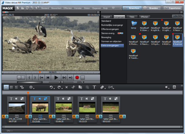Ten opzichte van de vorige versie heeft MAGIX behoorlijk wat vernieuwingen toegevoegd. Er zijn bijvoorbeeld meer menusjablonen waaruit u kunt kiezen. Daarnaast gebruikt u optioneel een filmsjabloon binnen het project. Op die manier voegt u eigen fragmenten aan een bepaald thema toe, bijvoorbeeld Drama, Actie, Huisdier of Reis. Ook het aanbod overgangen (met geluid) en speciale effecten is uitgebreid. Zo speelt u een bijzonder fragment in slow-motion af, zonder dat het beeld stottert. De nieuwe NewBlueFX Light Blends (overgangen) zien er weliswaar prachtig uit, maar zorgen ook voor hinderlijke haperingen in de voorbeeldweergave. Als u het project exporteert naar een filmbestand, lopen deze overgangen gelukkig wel vloeiend. Verder past u nu sneller beeldstabilisatie toe. Prettig is dat de ontwikkelaars ook onder de motorkap aan de software hebben gesleuteld. Het programma start voor een videobewerker erg snel op. Daarnaast maakt Video deluxe MX Premium voor bepaalde berekeningen gebruik van de grafische kaart, zodat de processor minder zwaar wordt belast. Ondanks laatstgenoemde maatregel, zijn de wachttijden over het algemeen nog vrij lang.