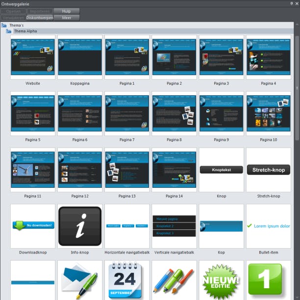 Twitter, Facebook, Google Maps, YouTube-fragmenten, Flickr-galerijen. U kunt het allemaal integreren in uw website. Pluk een element uit het lijstje widgets in de rechterkolom en sleep het naar uw webpagina. Daarnaast vindt u op het schijfje ook een erg uitgebreide selectie foto's, navigatiebalken, knoppen, iconen enzovoorts om uw webpagina's op te smukken. Ook downloadbare bestanden (bijvoorbeeld pdf, doc of mp3) kunt u toevoegen.