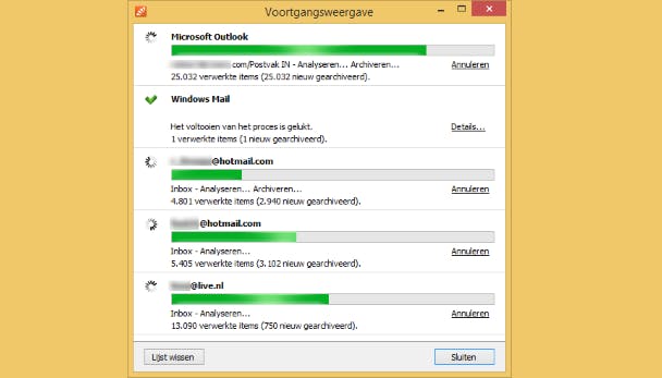 Een archief maken kan wat tijd kosten, zeker als je veel e-mails hebt en het van een server gehaald moet worden.