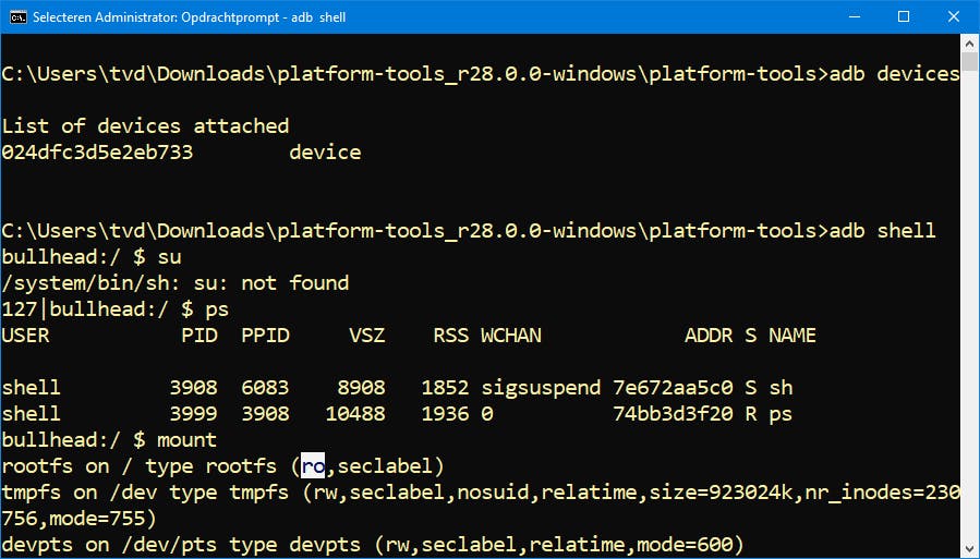 Als het goed is, verschijnt nu het id van je Android-apparaat. Verleen desgevraagd toelating op je apparaat, tik adb shell in en controleer met (een van) de volgende commando’s of het apparaat werd geroot: