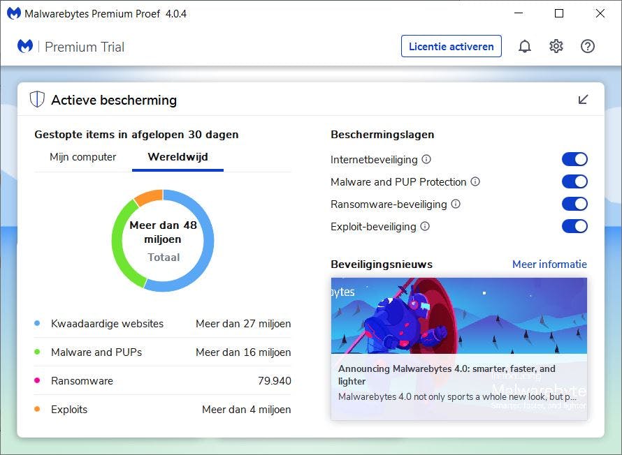 Eén van de nieuwe menu's toont in een cirkeldiagram welke soorten infecties door de software zijn tegengehouden. Daar wordt onder meer onderscheid gemaakt tussen 'kwaadaardige websites', malware en ransomware. Niet alleen op je eigen pc, maar ook wereldwijd. Verschillende Malwarebytes-onderdelen zijn hier afzonderlijk in te schakelen of juist uit te zetten.