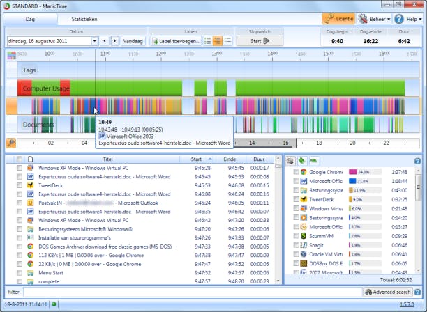 Het programma is verdeeld in twee tabbladen. In het eerste tabblad Dag staan vier verschillende tijdlijnen. In Labels staan uw zelfgemaakte labels, in Computergebruik staat of u actief of afwezig was, Programma's toont programma's u hebt gebruikt, en bij Documenten ziet u in welke documenten u bezig was. Wanneer u met de cursor over de tijdlijn schuift, verschijnt er een pop-up met meer informatie. Onder de tijdlijnen zijn alle geopende programma's en websites in twee vensters terug te zien.