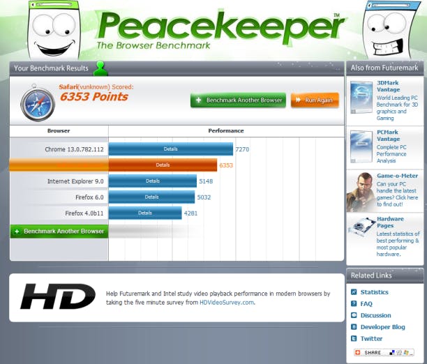 Omdat Maxthon ook de WebKit-engine gebruikt, wordt deze door Peacekeeper als Safari herkend.