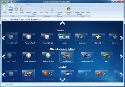Nadat u het programma hebt gedownload en geïnstalleerd, vindt u het via Start, Alle programma’s, Advent, Media Center Studio. Media Center Studio maakt gebruik van een ribbon (ofwel lint), zoals u mogelijk uit Office 2007 en Office 2010 bent gewend. Op het tabblad Home ziet u welke thema’s beschikbaar zijn (via het tabblad Theme). Het tabblad ernaast – Start Menu – laat zien hoe het menu van Media Center is opgebouwd.