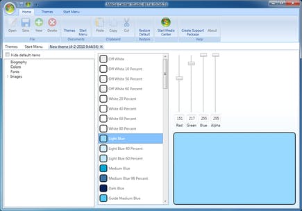 Klik op een thema om de instellingen te tonen. Om een nieuw thema te maken, kiest u voor New (in de sectie File) op de ribbon Home. Media Center Studio vraagt eerst om een enkele basisgegevens, zoals de naam van de maker en een eventuele beschrijving. Links vindt u de hoofdcategorieën: Colors, Font en Images. Klik op Colors. In het rechtervenster bepaalt u vervolgens de kleuren voor het thema. Hierbij gebruikt u de schuifregelaars om de kleurwaarden te bepalen. In de volgende sectie – Fonts – kunt u de lettertypen aanpassen. Kies per lettercategorie – zoals Button Text, Background Title Text en Thumbnail Button Text – welk font u eraan wilt toekennen en welke lettergrootte hiervoor nodig is.
