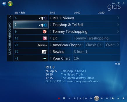 Standaard biedt de elektronische programmagids (EPG) een overzicht van zeven kanalen. Hebt u behoefte aan meer kanalen, zonder dat u door de gids hoeft te bladeren. Waar u ook zoekt, er is nergens een mogelijkheid om het aantal rijen te vergroten. Met een truc lukt dit alsnog. Allereerst haalt u een extra bestand binnen via http://download.hack7mc.com/download.php?id=68. In Media Center Studio kiest u voor New. Geef het thema een naam en sla deze op. Vervolgens selecteert u uw thema op het tabblad Themes. Klik hierna op de knop Apply. Sluit Media Center Studio en start Media Center opnieuw. De programmagids bestaat voortaan uit tien rijen met informatie.