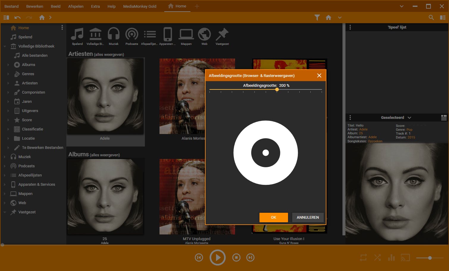 Vind je de albumhoesjes in de muziekcatalogus te klein? Dat kun je aanpassen! Navigeer bovenin de menubalk achtereenvolgens naar Beeld / Weergave hoofdvenster / Afbeeldingsgrootte. Sleep het oranje schuifje nu naar rechts om de albumcovers te vergroten. Je klikt als laatste op OK om het resultaat te bekijken.