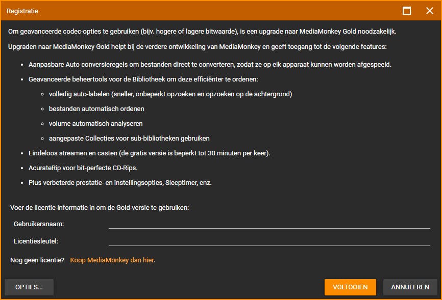 Voor het gebruik van MediaMonkey Gold dien je een gebruikersnaam en licentiesleutel in te voeren.