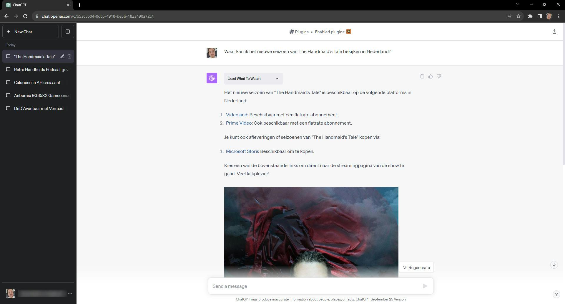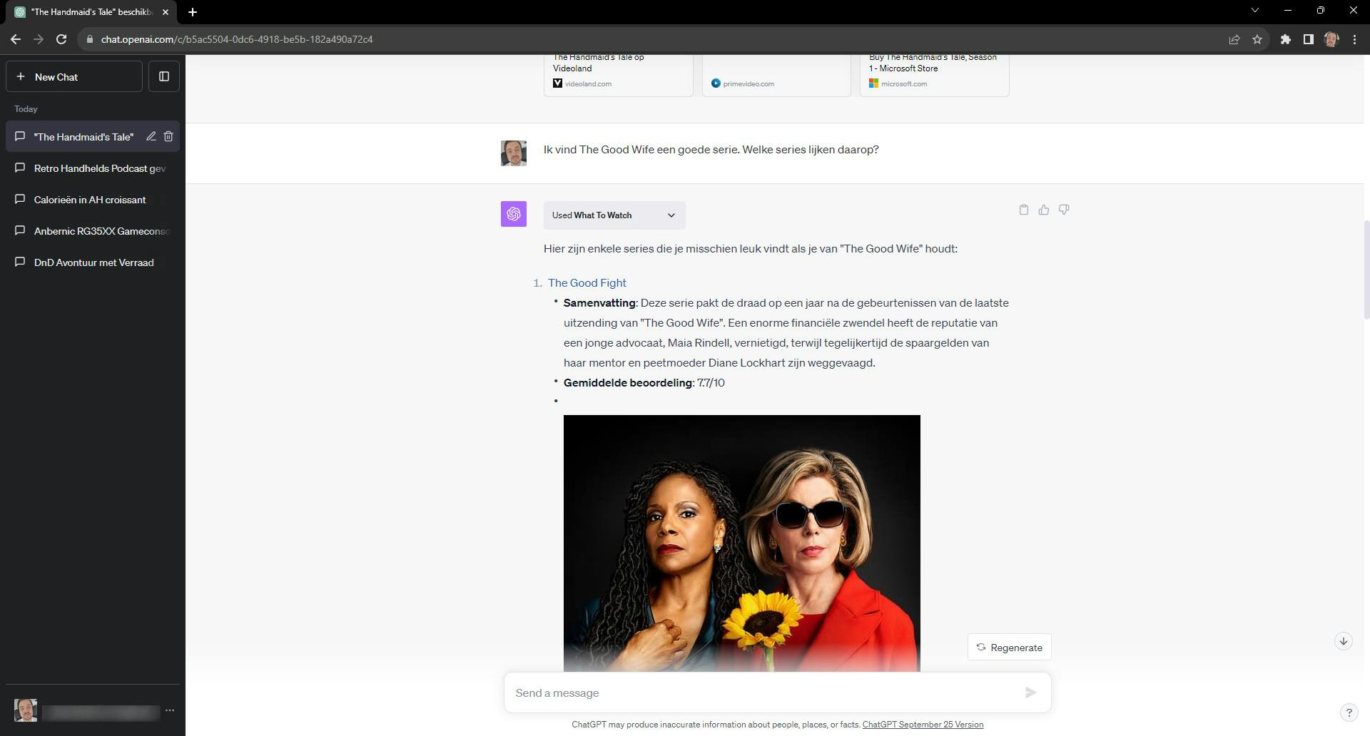 Nog zo’n ding: niet weten waar je een bepaalde serie of film kunt kijken. Nu hebben we daar in Nederland wel handige websites voor, zoals Film.nl. Maar met een plug-in als What to Watch voor ChatGPT Plus kun je net even wat meer. Je krijgt wat meer context over de film of serie mee, inclusief links naar de platforms waarop die beschikbaar zijn. Als je wilt kun je hier ook seriesuggesties vandaan halen. Geef aan waar je graag naar kijkt en vraag wat daarop lijkt. What to Watch zoekt dan voor je uit wat daar het best bij past en geeft een samenvatting plus online beoordeling.
