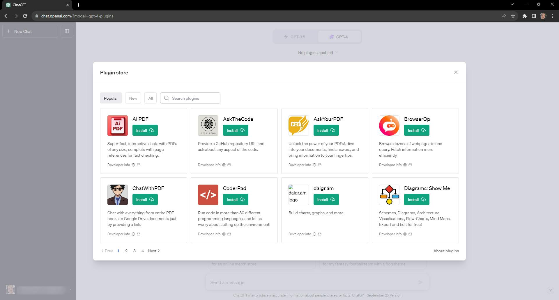 Klik nu op GPT-4 bovenin en daarna op Plugins. No Plugins enabled is de volgende halte, zodat je daarna op Plugins store kunt klikken. Nu verschijnt er een nieuwe pop-up in beeld met allerlei plug-ins en een zoekveld. Installeren gaat simpel: daarvoor druk je op de groene Install-knop die bij een plug-in staat.