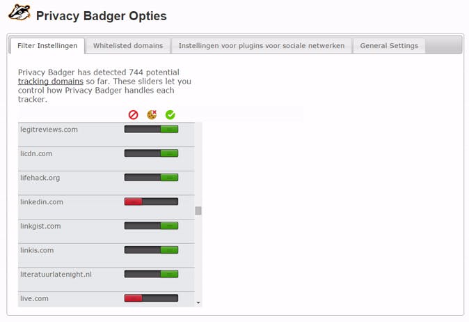 Bij Privacy Badger kun je per site aangeven of er cookies geplaatst mogen worden.