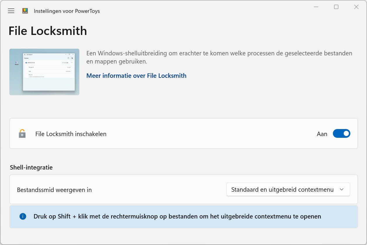 Je kent het ongetwijfeld: je wilt een bestand verwijderen, verplaatsen of hernoemen, maar Windows weigert met de melding dat het bestand in gebruik is. Erg frustrerend, vooral als het om één bestand gaat van een volledige set die je graag in één keer hernoemt. Met File Locksmith, een programma dat toevallig ook deel uitmaakt van de besproken PowerToys, verhelp je deze situatie. Open het dashboard van PowerToys en kies File Locksmith. Zet de schuif op Aan bij File Locksmith inschakelen. Kom je een vergrendeld bestand tegen, klik er dan voortaan met de rechtermuisknop op en kies voor Unlock with File Locksmith.