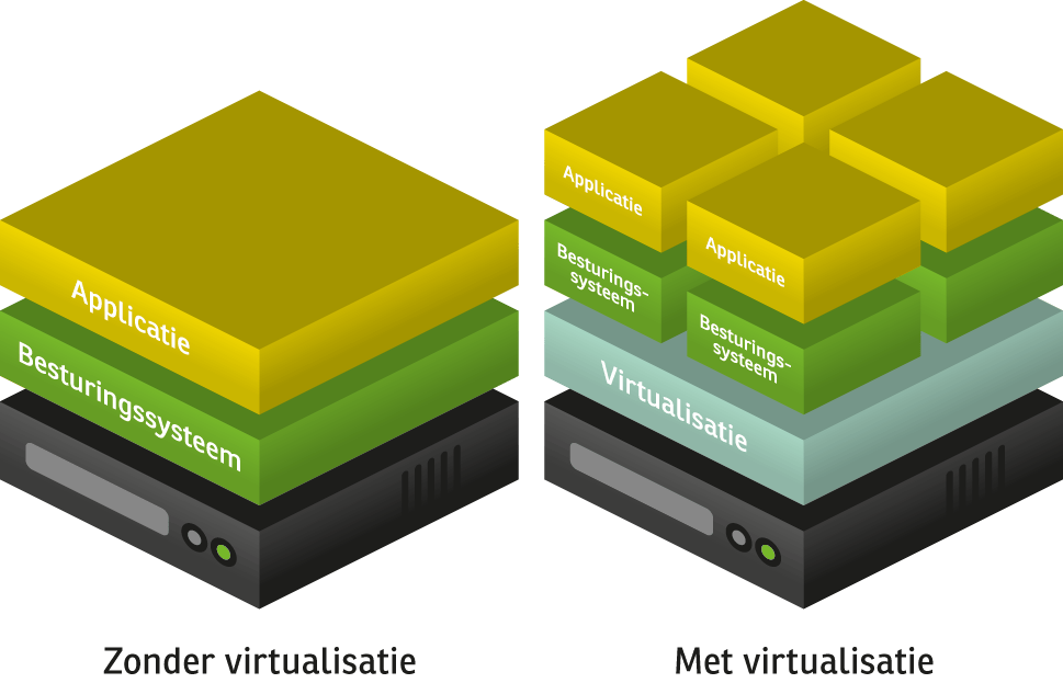 Een type1-hypervisor (rechts) draait rechtstreeks op de hardware, zonder tussenliggend besturingssysteem.