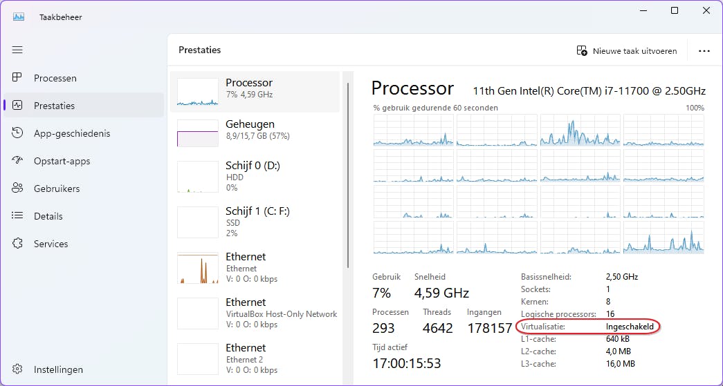 Voldoende geheugen is in elk geval nodig voor een vlotte werking: reken op minimaal 8 GB intern geheugen op de host. Tevens moet hardwarevirtualisatie zijn ingeschakeld. Dit controleer je snel vanuit het Taakbeheer (druk op Ctrl+Shift+Esc): ga naar Prestaties, klik op Processor in de linkerzijbalk en check of er Ingeschakeld staat bij Virtualisatie. Zo niet, dan moet je dit nog inschakelen in het UEFI/BIOS, bij een instelling als Intel VT-x, AMD-V, Virtualization Technology of Advanced CPU Configuration. Raadpleeg indien nodig je systeemhandleiding. Heb je dit voor elkaar, dan kun je in principe aan de slag.