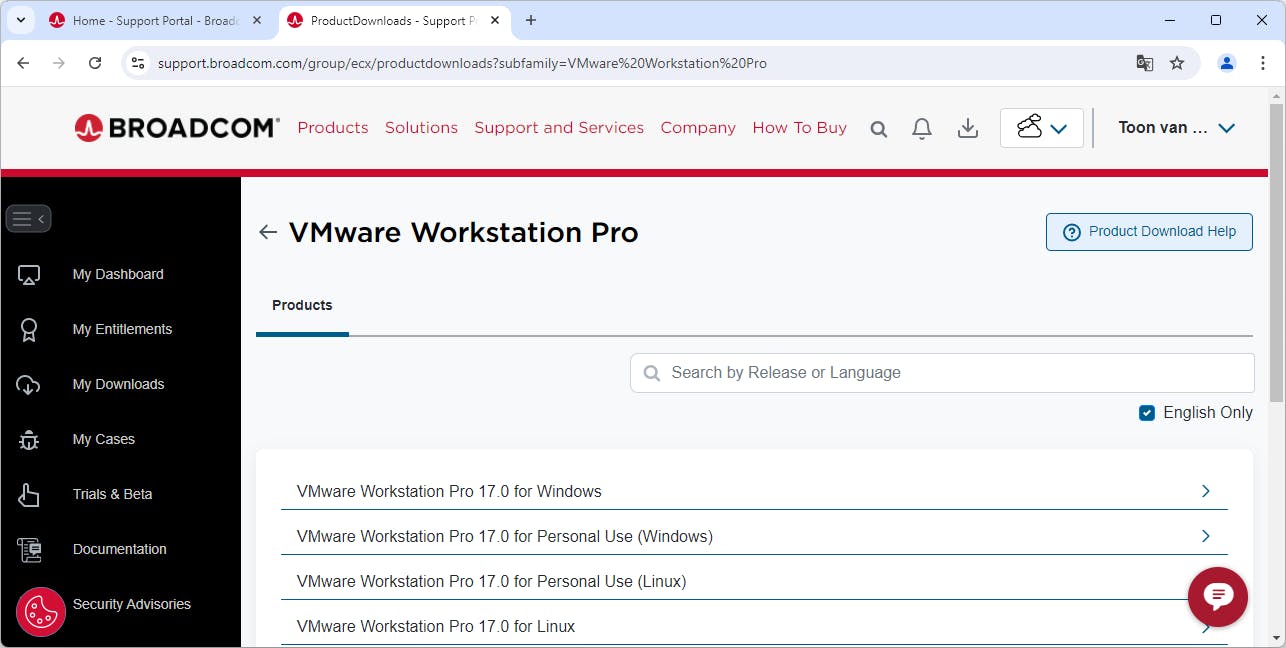 Om de gratis versie van Workstation Pro te downloaden en gebruiken, moet je je registreren op https://support.broadcom.com. Dit heeft de eerste keer wel wat voeten in de aarde: klik rechtsboven op Register, vul je e-mailadres en de captcha in, druk op Next en voer de verificatiecode uit het ontvangen e-mailbericht in. Klik op Verify & Continue en vul de gevraagde gegevens in, zoals naam en wachtwoord. Bevestig met Create Account. Klik rechtsboven op Login om je aan te melden met je e-mailadres en wachtwoord.