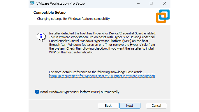 Voor compatibiliteit tussen Workstation Pro en Hyper-V-functies installeer je ook WHP: het Windows Hypervisor Platform.