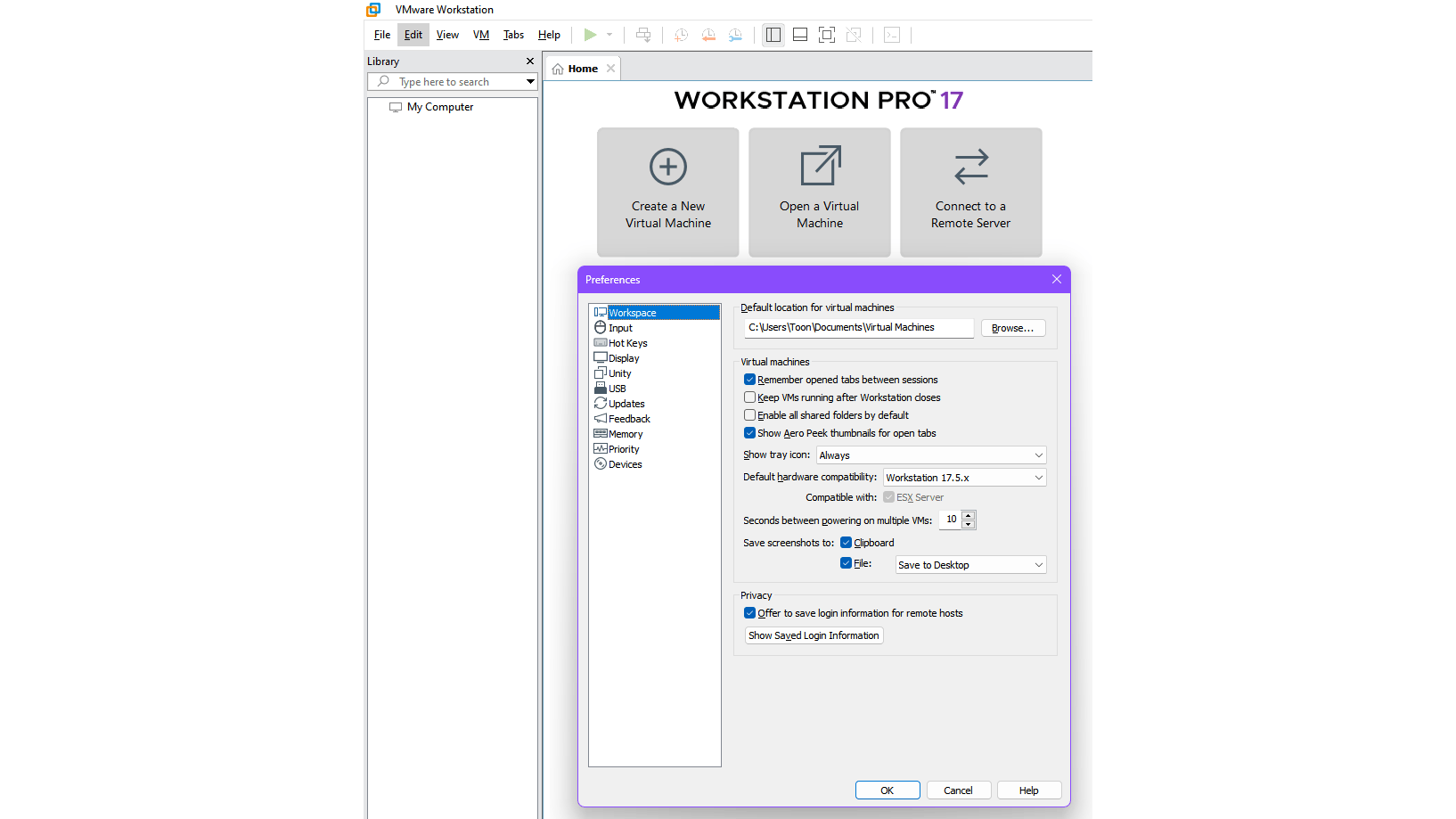 Hoewel de knop Create a New Virtual Machine verleidelijk oogt, is het goed om eerst Edit / Preferences te openen. Hier vind je veel opties. In de rubriek Workspace bepaal je via Browse waar je de virtuele machines standaard wilt installeren. Kies een locatie met voldoende vrije schijfruimte (een enkele VM kan snel tientallen GB in beslag nemen) en uit prestatie-overwegingen bij voorkeur niet op een netwerkshare. De optie Default hardware compatibility staat standaard ingesteld op Workstation 17.5.x, wat je het best zo laat, tenzij je bijvoorbeeld VM’s van een oudere installatie gebruikt.
