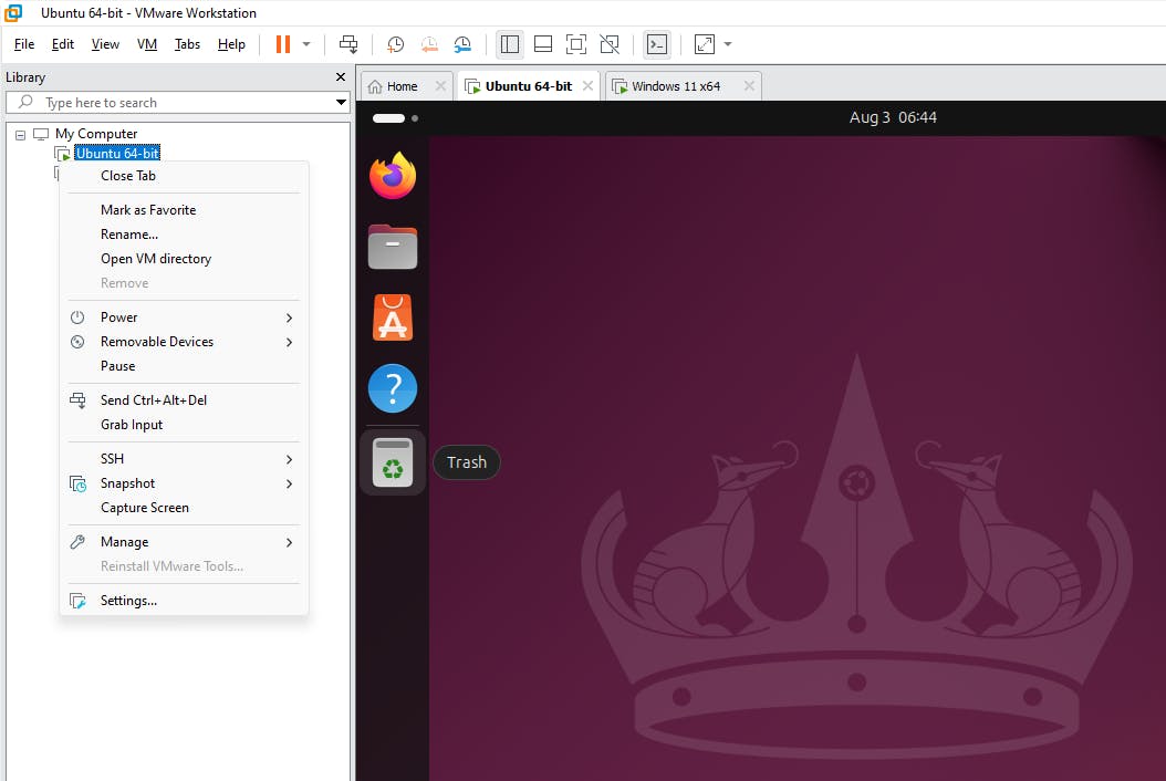 Zoals aangegeven kun je meerdere VM’s tegelijk starten, zolang er voldoende systeembronnen op je host beschikbaar zijn. Elke VM opent dan op een apart tabblad. Een VM laat zich bedienen zoals een fysieke installatie, maar er zijn enkele extra functies beschikbaar. Vanuit de knoppenbalk bovenaan via het menu VM of vanuit het contextmenu van een actieve VM kun je je VM afsluiten (Power / Power off) of de huidige sessie stopzetten (Suspend) en later weer hervatten.