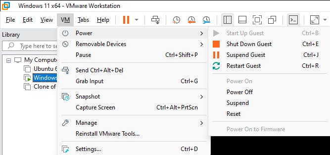 Je kunt een virtuele machine pauzeren, afmelden en (netjes of abrupt) afsluiten.