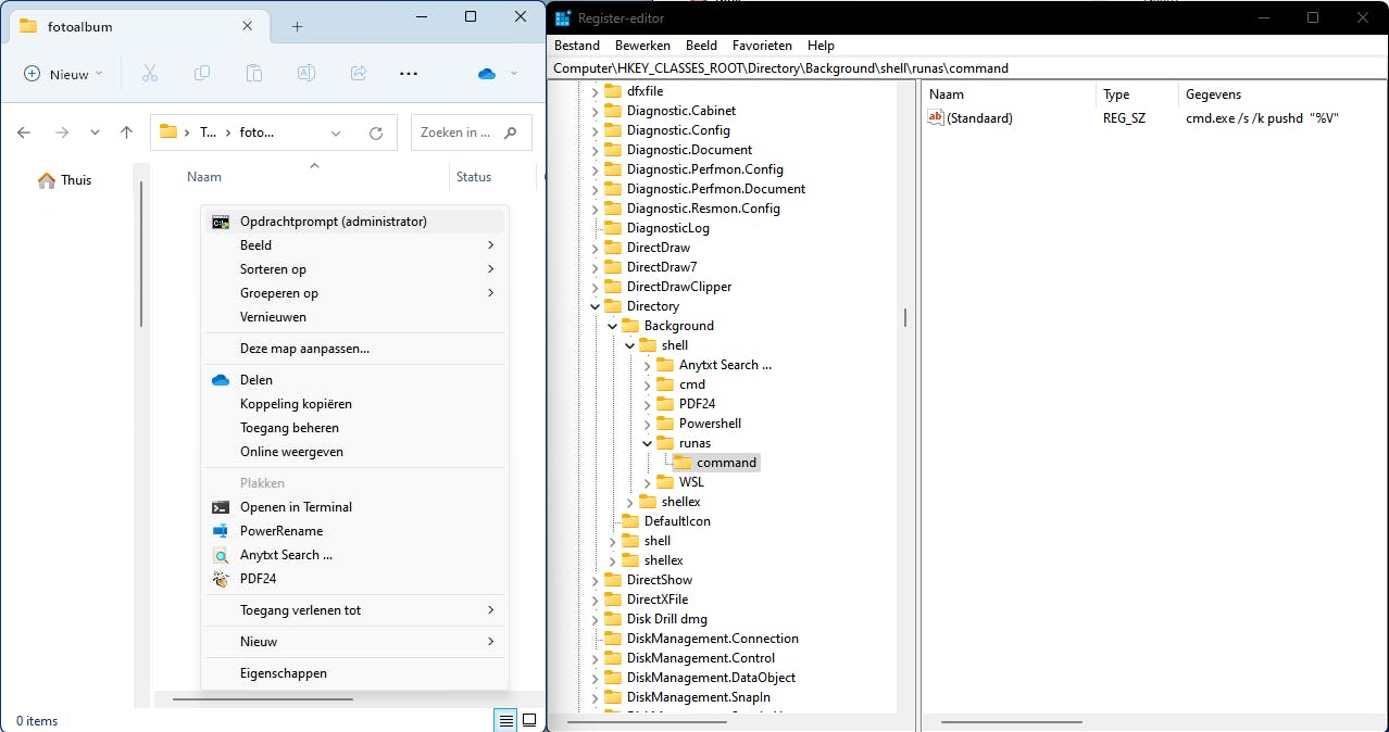 Als je de Opdrachtprompt direct in een specifieke map wilt openen, bijvoorbeeld om bestandsbewerkingen uit te voeren, navigeer je in Verkenner naar de gewenste map, klik je met de rechtermuisknop op een lege plek in deze map en kies je Openen in Terminal. Helaas gebeurt dit niet als administrator. Als je dit wel wilt, is er een vrij complexe registerbewerking nodig. De stappen hiervoor worden hier beschreven. We hebben deze procedure succesvol getest op Windows 11, maar let op die pagina goed op de tekst in de bijbehorende schermafbeeldingen.