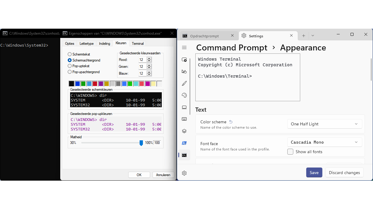 Je kunt het uiterlijk van het oude venster aanpassen door rechts te klikken op de titelbalk en Eigenschappen te selecteren, maar Windows Terminal biedt meer mogelijkheden. Als je met rechts klikt op het geopende tabblad, kun je via Color de kleurweergave wijzigen. Voor meer opties klik je op het pijlknopje en kies je Instellingen. Open vervolgens Command Prompt en bekijk de opties onder Appearance en Advanced. Wil je dat het standaardprofiel Command Prompt is bij het opstarten van de Terminal-app, stel dat dan in via Instellingen / Startup.