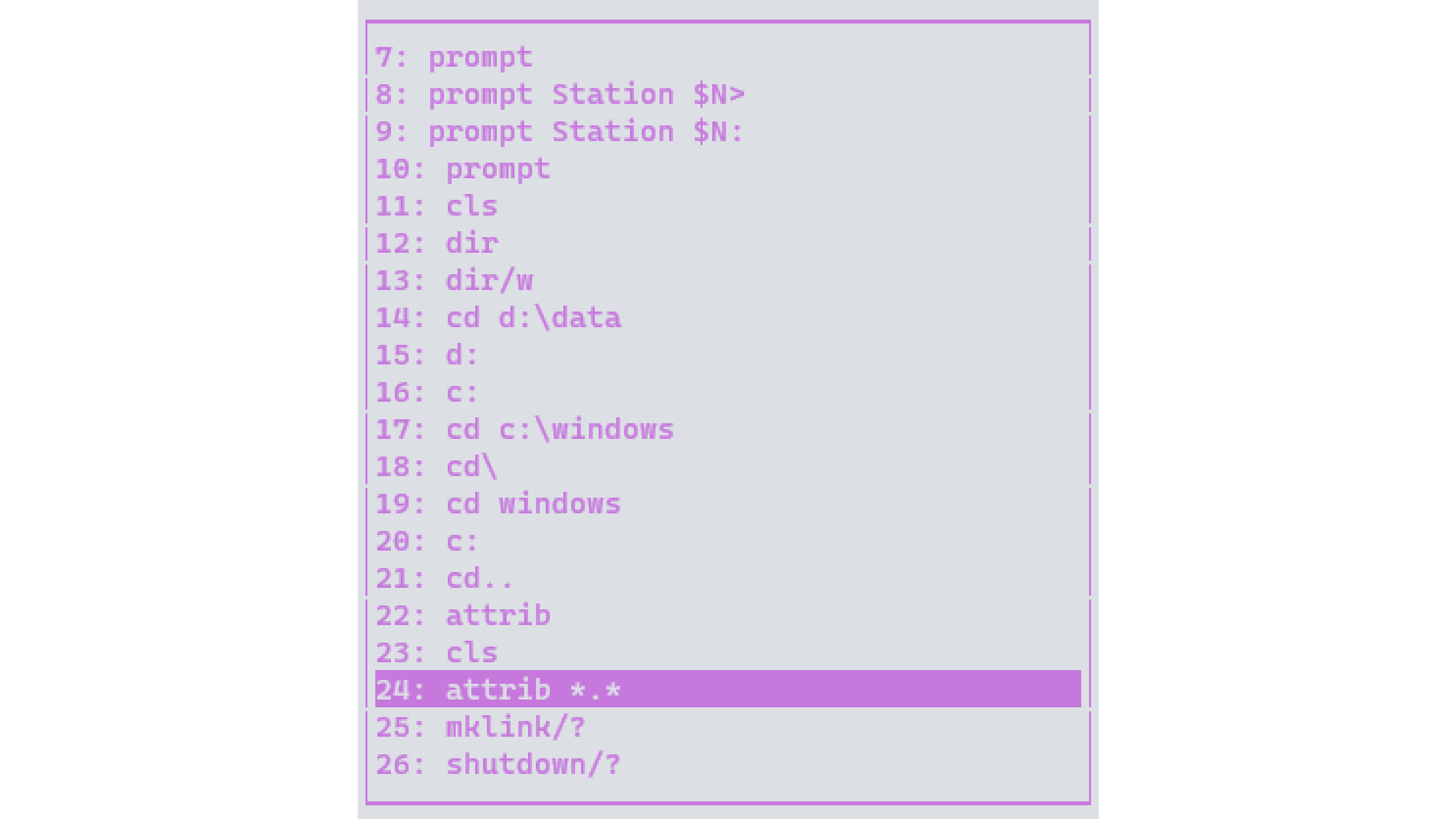 Om snel een eerder uitgevoerd commando te herhalen, druk je op F3 (voor het vorige commando) of op F8 (hiermee navigeer je omgekeerd chronologisch door je commandolijst). Druk je op F7, dan zie je een menu met de commandogeschiedenis en selecteer je met de muis of de pijltoetsen het gewenste commando.