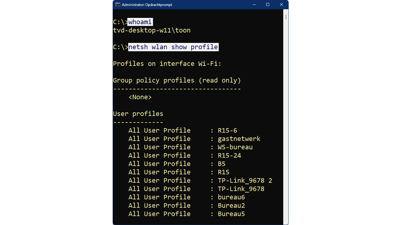 Om snel uit te zoeken met welk account iemand is aangemeld en wat de computernaam is, volstaat het commando whoami. Wil je ook weten tot welke groepen de gebruiker hoort, gebruik dan: