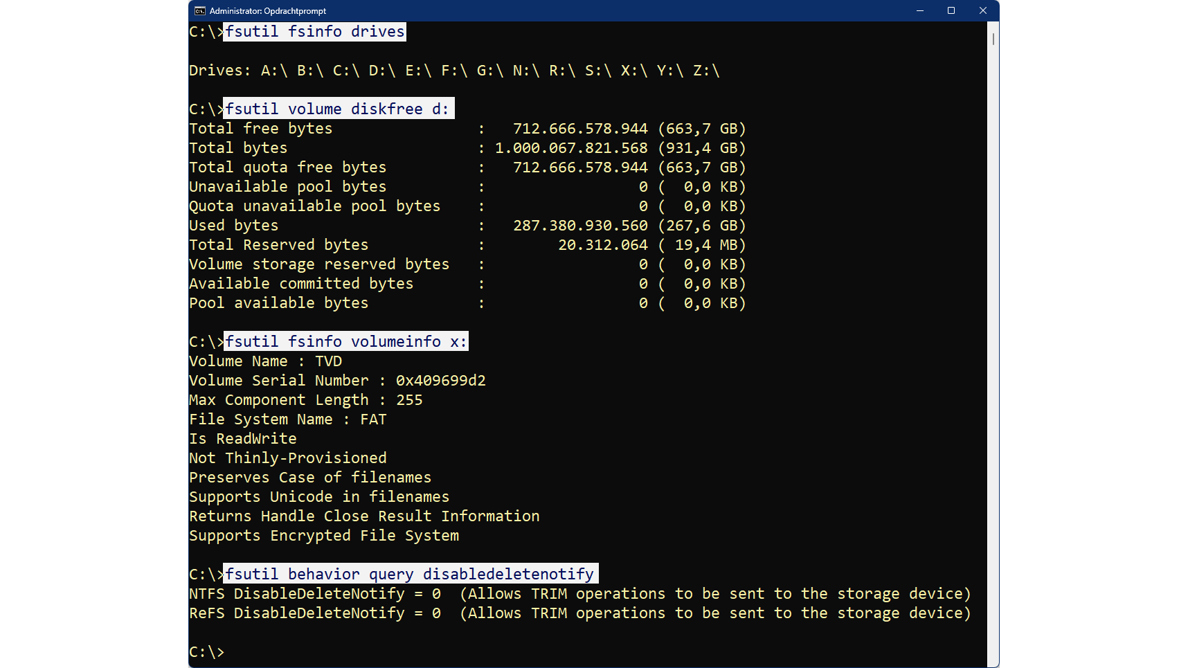 Met fsutil kun je niet alleen informatie opvragen, maar ook bepaalde functies aanpassen. We nemen de zogeheten TRIM-functie op een ssd-schijf als voorbeeld. Deze zorgt ervoor dat data van verwijderde bestanden op de betreffende ssd-sectoren tijdens onbenutte momenten echt worden gewist, zodat dit niet meer hoeft te gebeuren op het ogenblik dat daar nieuwe bestanden worden bewaard. Deze functie zorgt er dus voor dat gegevens sneller naar de ssd worden geschreven. Hiermee vraag je de actuele TRIM-status op: