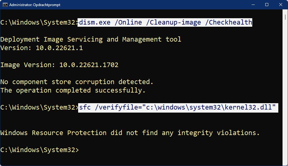 Het kan ook gebeuren dat sommige Windows-functies niet meer (goed) functioneren of dat Windows Update klaagt over systeembeschadigingen. In dat geval kun je een analyse laten uitvoeren van alle belangrijke systeembestanden. Start de Opdrachtprompt als administrator en voer het volgende uit om de gezondheidsstatus van je lokale Windows-image te controleren: