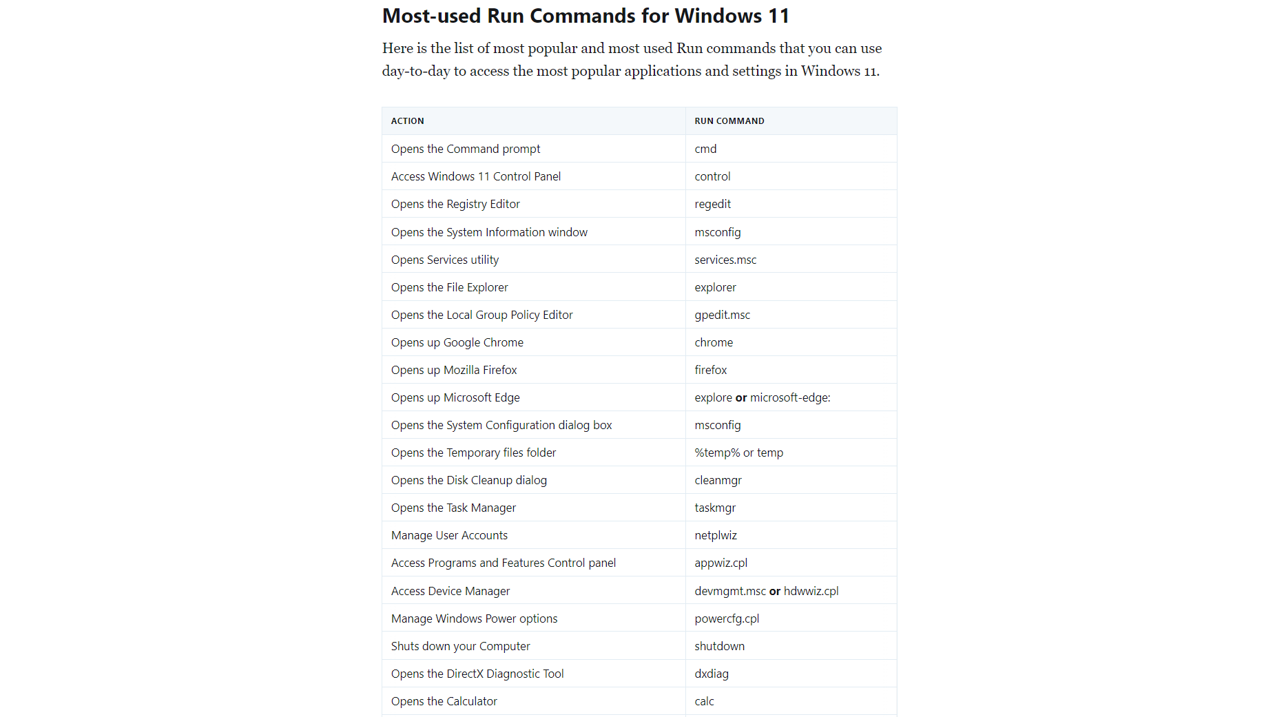 Het gaat om zeer uiteenlopende commando’s (enkele honderden), probeer het maar eens met commando’s als cmd, regedit, ms-settings:colors en displayswitch. Teveel om hier op te noemen dus, maar op een site als All Things How vind je ze vrijwel allemaal. Wij hebben er zo’n 350 geteld.