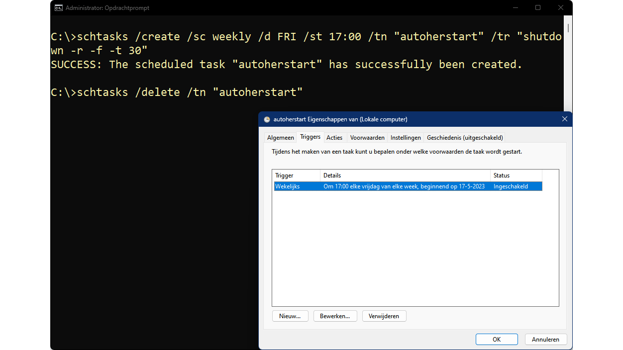 Gebruik het commando schtasks (schedule tasks), uit te voeren als administrator. Om bijvoorbeeld een wekelijkse, automatische herstart in te plannen, voer je het volgende commando uit: