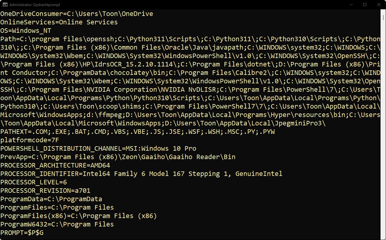 Om dit te doen, start je de Opdrachtprompt op als administrator. Gebruik het commando set om een overzicht van de omgevingsvariabelen te krijgen, inclusief de variabele path. Met echo %path% krijg je alleen de inhoud van de path-variabele te zien. Voeg het volledige pad naar de map met de batchbestanden toe aan de path-variabele met het volgende commando: