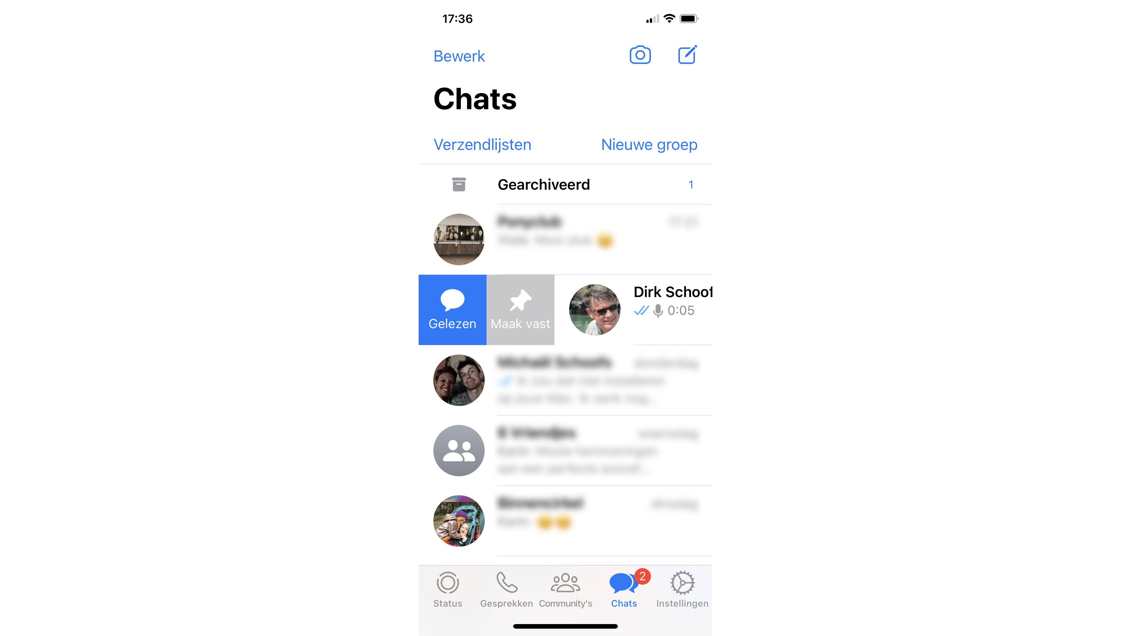 Zodra een bericht is verzonden, wordt het weergegeven als een thread in het hoofdtabblad Chats. Zoals alle andere WhatsApp-chats, wordt deze conversatie naar beneden geduwd wanneer er nieuwe berichten met andere contacten worden uitgewisseld. Om je eigen chatberichten in het zicht te houden, kun je deze conversatie bovenaan in de conversatielijst vastzetten. Hiervoor moet je eerst naar het tabblad Chats navigeren. Daarna verschilt de aanpak tussen iOS en Android. In iOS zoek je in de lijst naar het gesprek dat je wilt pinnen. Vervolgens veeg je kort van links naar rechts over de chat en tik je op Maak vast. In Android tik je op de chat, houd je deze vast en selecteer je het punaisepictogram in de opties die bovenaan te zien zijn.