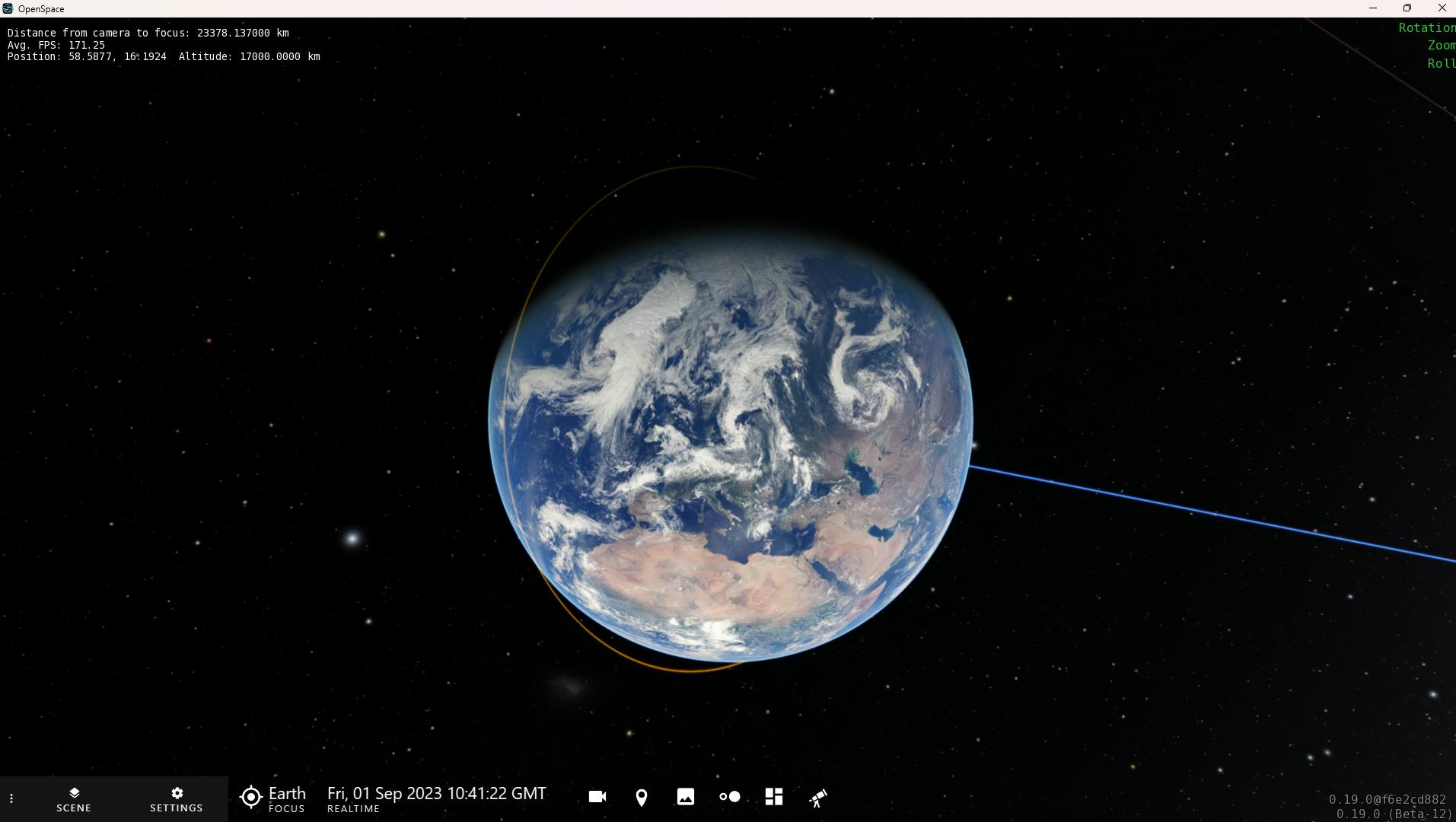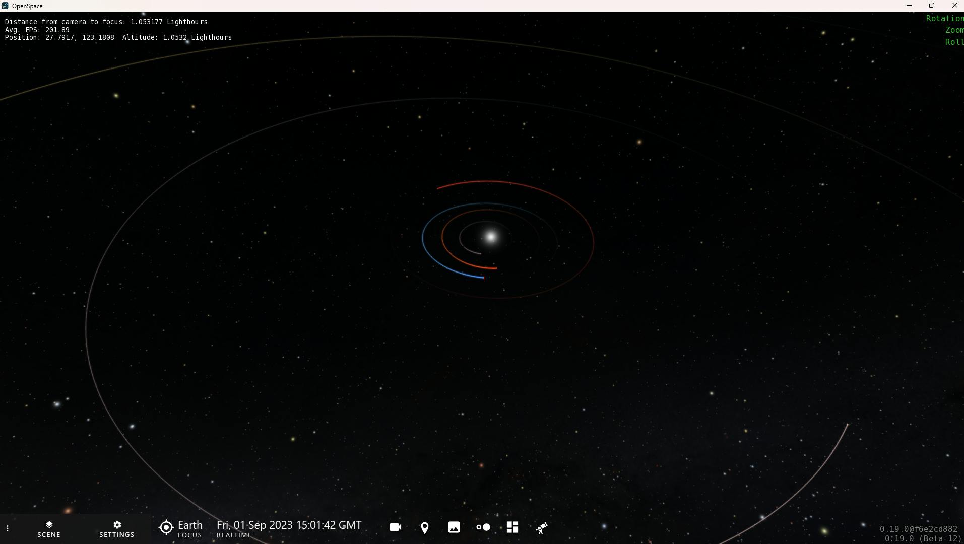 Door te slepen met ingedrukte linkermuisknop kun je om de Aarde of een ander geselecteerd object heen bewegen. Slepen met ingedrukte rechtermuisknop zorgt dat je naar een object toe of er vanaf beweegt. Voor een hogere snelheid kun je daarbij de Z-toets indrukken. Gebruik deze twee functies om zo te roteren en zo ver uit te zoomen dat je de zon in het midden van het scherm ziet en ook de banen van een aantal planeten zichtbaar worden.
