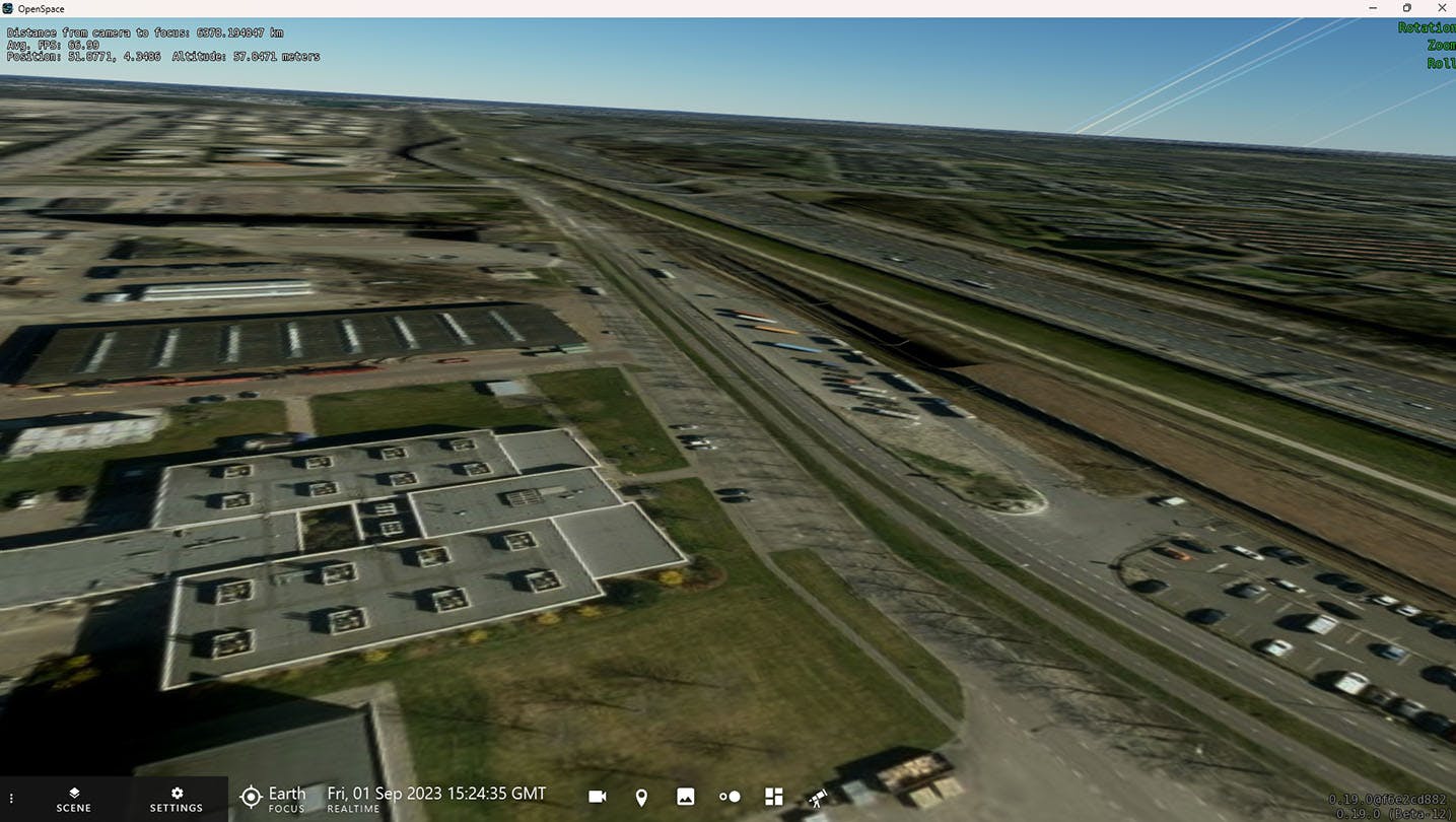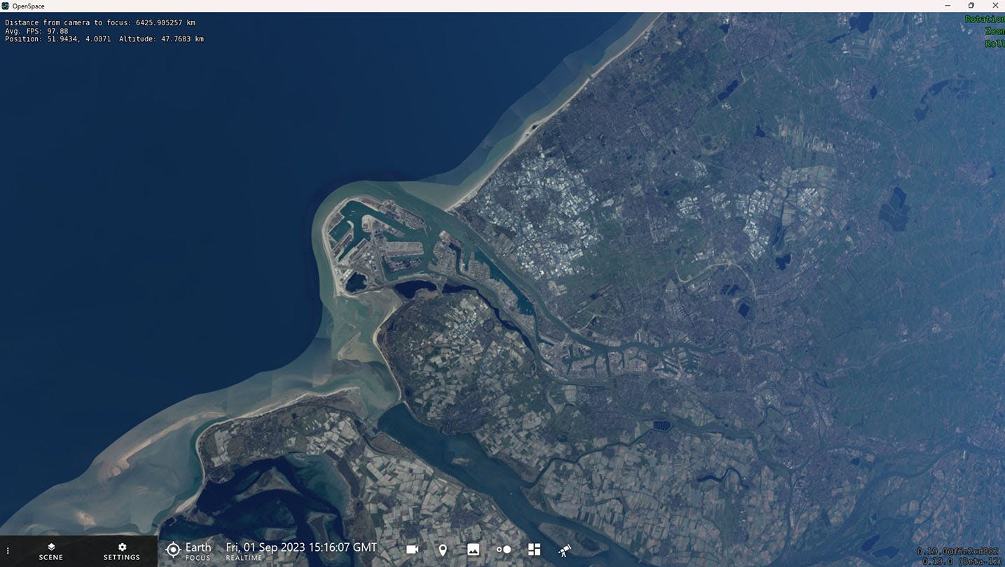 Nu je weet hoe je ten opzichte van de aarde moet navigeren, bewegen we weer naar onze planeet toe. Daarbij kun je zo dichtbij komen als je wilt. We zoeken Nederland en zoomen in (een term die niet helemaal accuraat is, want we bewegen ernaartoe). Terwijl we dichterbij komen, haalt OpenSpace steeds gedetailleerder beeldmateriaal op.