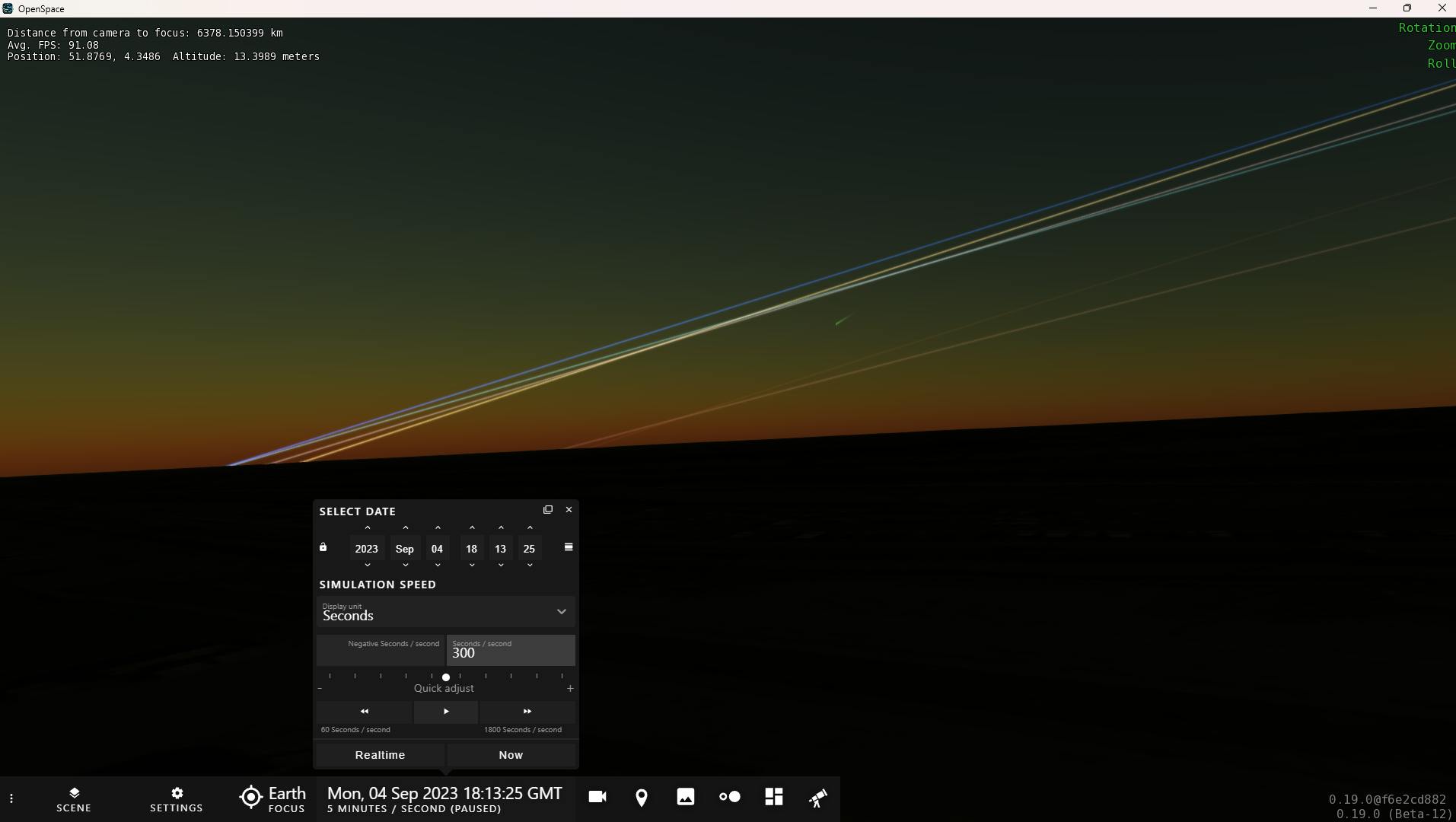 We kunnen niet alleen door de ruimte navigeren, maar ook door de tijd. Klik op de datum en tijd onder in beeld. Je kunt vervolgens de huidige datum en tijd kiezen door op Now te klikken. Zou je datum en tijd wijzigen terwijl je de Aarde vanuit de ruimte bekijkt, dan zou OpenSpace zelfs proberen om bijpassende beelden van weersatellieten te downloaden.